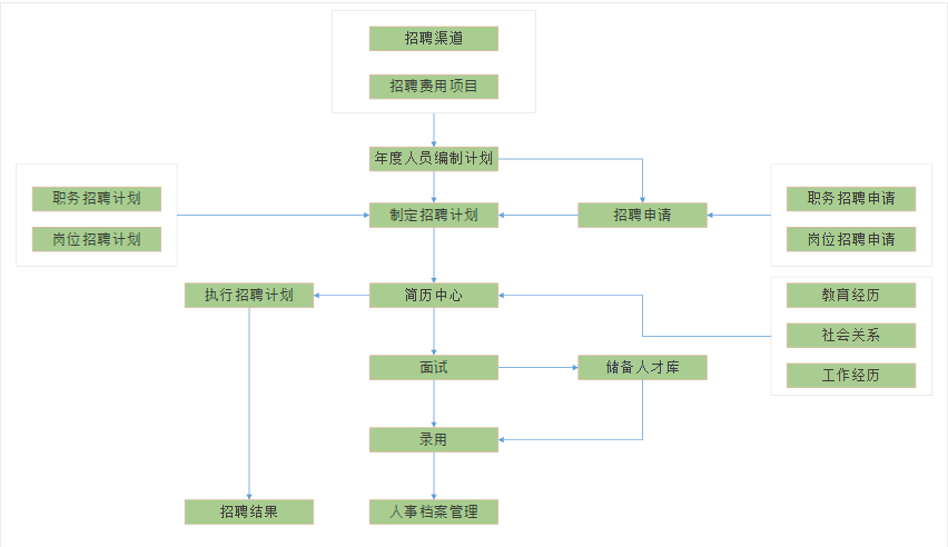 下面介紹一下同鑫招聘選撥模塊的功能情況:招聘渠道、招聘費用、年度編制計劃、任職職務資格、崗位的招聘計劃、招聘的申請、簡歷的收取、面試選撥、錄用、淘汰管理、人事檔案管理。