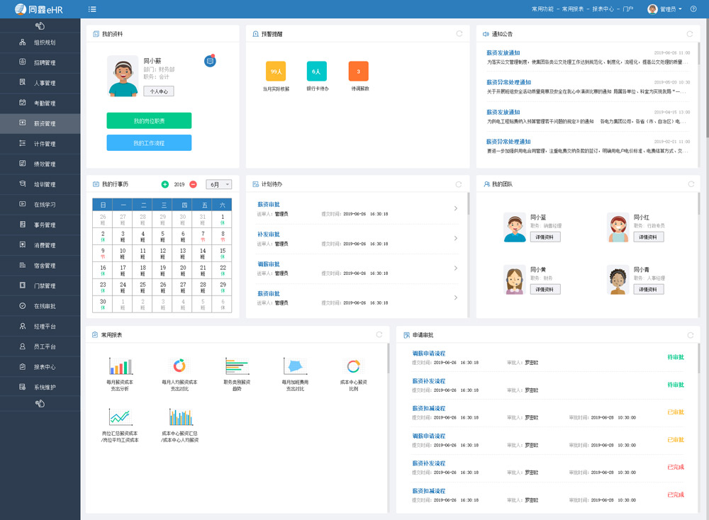 ● 我的崗位:即時調閱當前崗位職責;● 計劃待辦:本部門所有的計劃事項進度及當前需要辦理的事務信息;● 預警提醒:本部門所有的HR管理的異常情況提醒;● 申請審批:辦理本部門所有成員提交過來的申請審批單據;● 我的行事歷:萬年歷網格化顯示每天的關鍵工作事項;● 我的團隊:即時查詢本部門所有成員的個人信息,可在線溝通;● 常用報表:扁平化多維度圖形顯示本部門HR相關統計分析報表;● 通知公告:全公司發布的通知即時顯示。